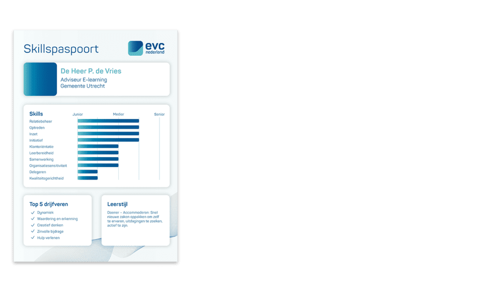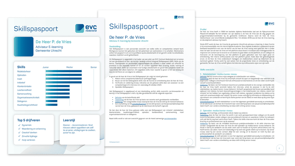EVC Nederland heeft een unieke en innovatieve manier om je skills te valideren: het gevalideerde Skillspaspoort. Dit is een persoonlijk overzicht van je skills en drijfveren, gebaseerd op een talenten scan, 360 graden feedback (optioneel) een gesprek met een assessor. Dit laatste maakt het Skillspaspoort objectief en betrouwbaar gevalideerd door een onafhankelijke partij. Het geeft je een duidelijk beeld van je talenten, je mogelijkheden en je ontwikkelpunten.